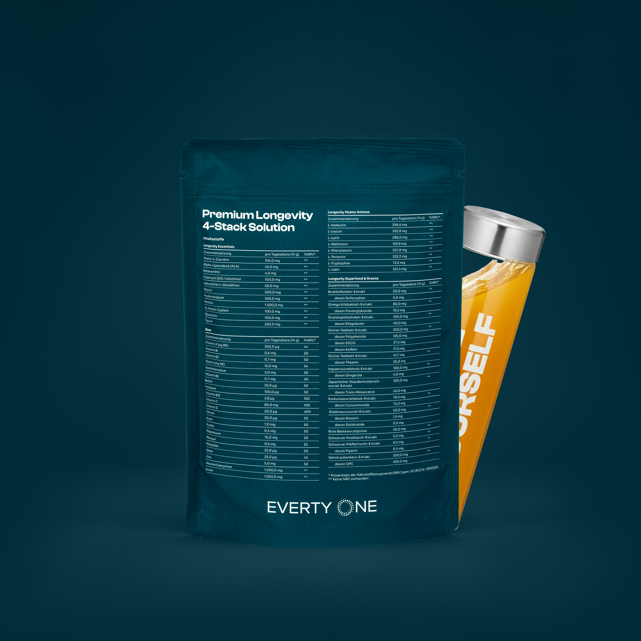 EVERTY ONE ist ein Premium Longevity-Drink mit über 50 sorgfältig ausgewählten Inhaltsstoffen – entwickelt gemeinsam mit unabhängigen Expert:innen, um dich auf zellulärer Ebene zu unterstützen und täglich in deiner Bestform zu performen.